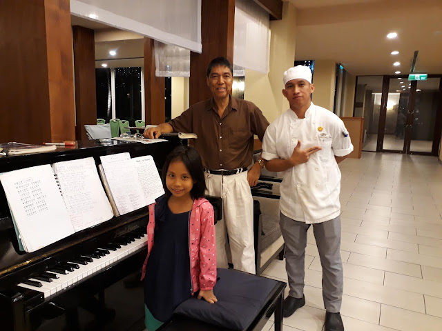 The father had a music score for her daughter to play. There are 2 tables of bar guests at that time. I let her play for a few minutes. When the father insists that she play some more, I told him that I am playing there for 2 hours to satisfy the guests and not the 2 of them. He understands it as they are not ordering drinks to have the hotel have at least a minimum of sale or profit.